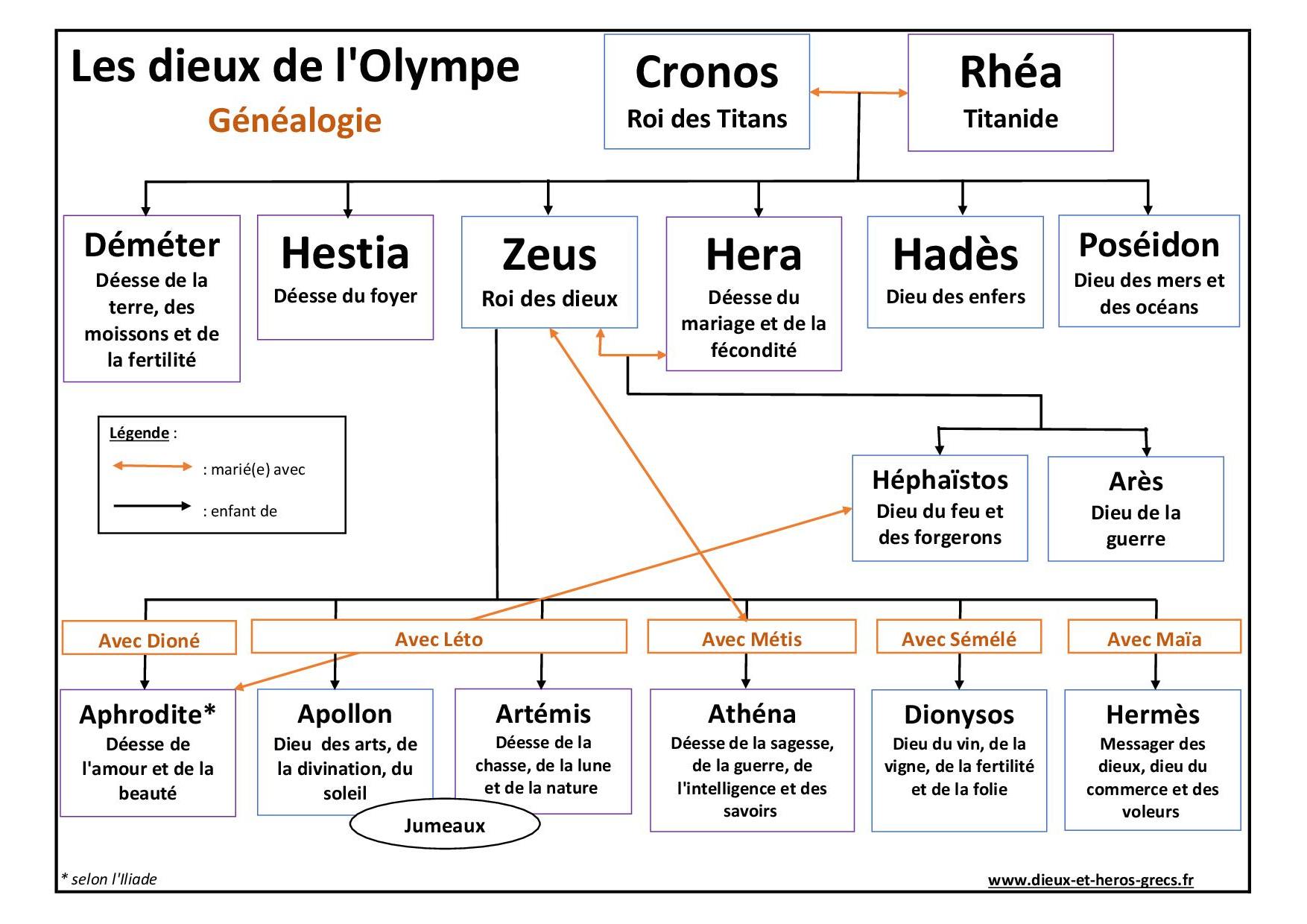 L'infographie ci-dessous présente la généalogie des dieux de l'Olympe. Qui sont les enfants de Zeus ? Qui sont les parents d'Athéna ? Qui sont les frères et sœurs de Poséidon ?... L'arbre généalogique vous permettra de répondre à toutes ces questions car il met en évidence les liens de parentalité entre les dieux.