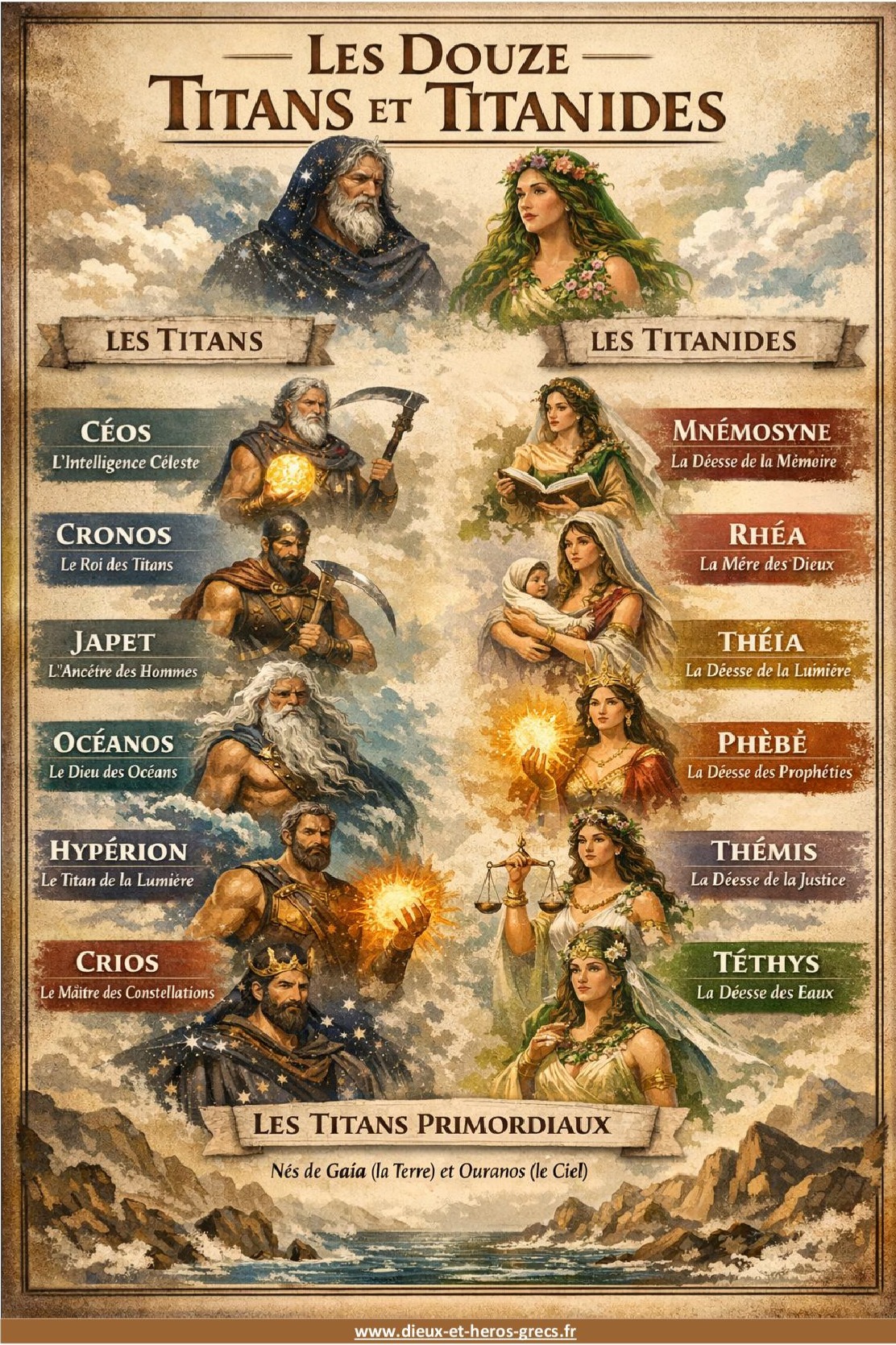 - ⚡ Les 12 Titans et Titanides : Océanos, Céos, Crios, Hypérion, Japet, Cronos, Théia, Rhéa, Thémis, Mnémosyne, Phébé et Téthys.